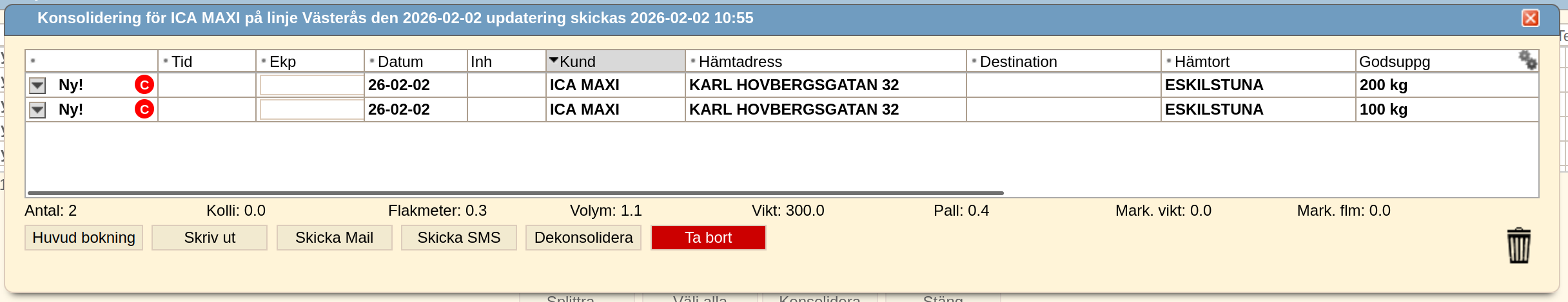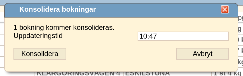 Alla inkommande bokningar på samma kund, linje och hämtdatum kommer samlas in under huvud (SF) bokning. Man kan konsolidera manuellt existerande bokningar (ej SF och om matchande huvud bokningen hittas) igenom att markera och trycka på Konsolidera knappen.